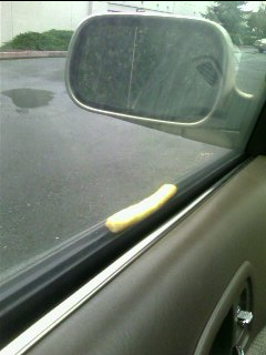 This one is the magic french fry. Kerry and I were going to get haircuts many months ago and on the way we stopped at a fast food place and got something to eat. There was a problem with one of the French fries and so I rolled the window down a little and tossed it out, but it landed on the outside ledge of the window... and stayed there... and stayed there... and stayed there. The picture is after we had driven several more miles and arrived at our destination.
